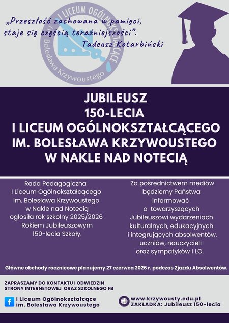 Rada Pedagogiczna I Liceum Ogólnokształcącego im. Bolesława Krzywoustego w Nakle nad Notecią ogłosiła rok szkolny 2025/2026 Rokiem Jubileuszowym 150-lecia Szkoły.