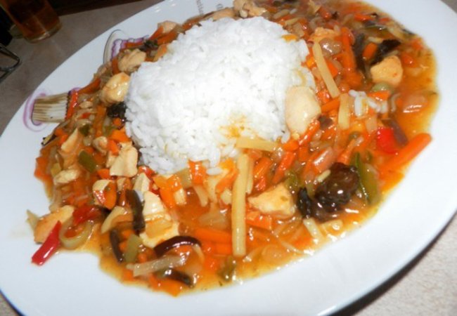 Sposób przygotowania Ryż gotujemy, mięso kroimy w kosteczkę i podsmażamy na patelni. Gdy się już podsmaży ok 5-7 min., wrzucamy warzywa na patelnię i smażymy od 5-10 min. Fix mieszamy w misce z wodą aż do rozpuszczenia składników i dolewamy do kurczaka i warzyw, następnie podsmażamy. Po kilku minutach ryż rozkładamy na talerzach i zalewamy kurczakiem warzywami i sosem. Smacznego!