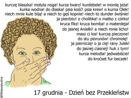 17 grudnia obchodzimy Dzień bez Przekleństw. Jak można domniemać, ma on polegać na powstrzymaniu się od przeklinania. W Polsce to święto jest bardzo młode, bo obchodzone zaledwie od paru lat. Jest dość słabo rozpowszechnione, większość ludzi nawet o nim nie wie.
