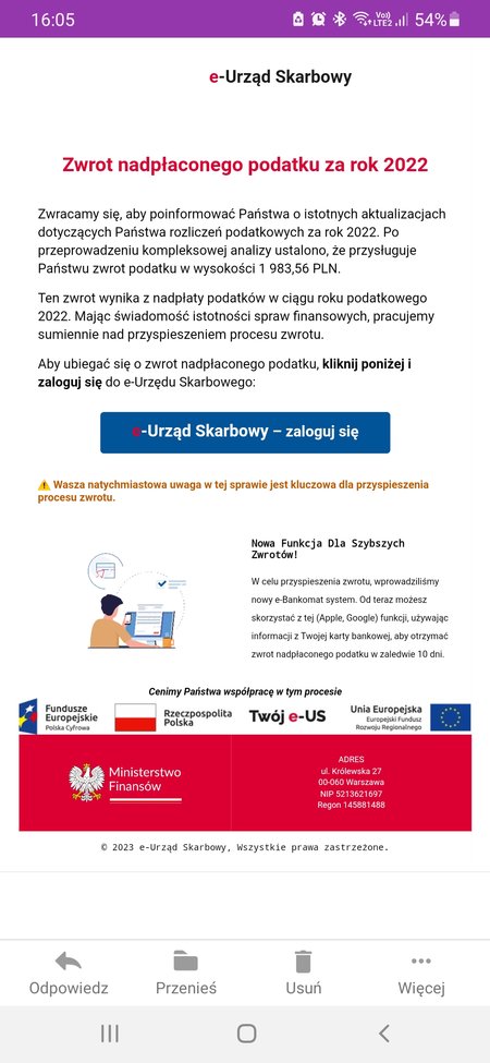 Ostrzegamy przed fałszywymi e-mailami o #zwrocie nadpłaconego podatku za 2022 r. Pocztą elektroniczną rozsyłane są fałszywe wiadomości, których autor podszywa się pod Ministerstwo Finansów i informuje o zwrocie podatku. Ministerstwo Finansów i Krajowa Administracja Skarbowa nie wysyłają tego typu wiadomości do podatników.
