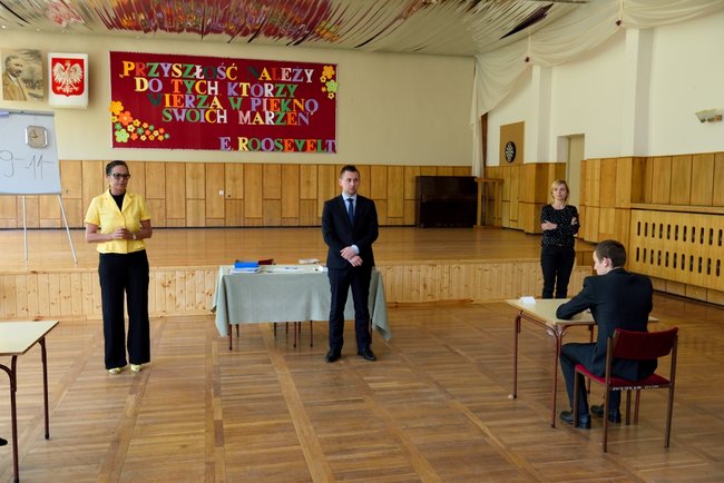 Nieco zestresowanych i przejętych powagą sytuacji uczniów przywitała pani Dyrektor Małgorzata Ciechanowska, która życzliwymi słowami dodała zdającym otuchy, podkreślając również, że wierzy w ich polonistyczne umiejętności.