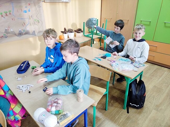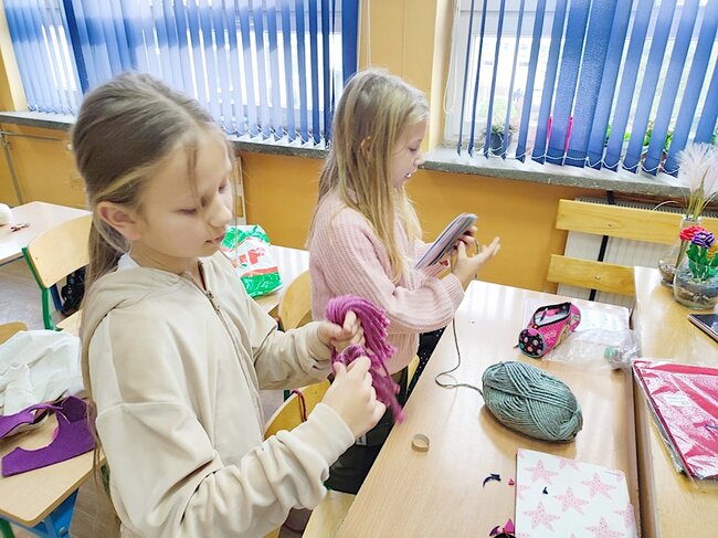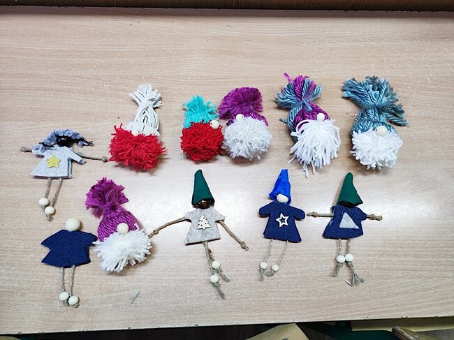 Celem spotkania było wykonanie ozdób świątecznych na kiermasz szkolny, który odbędzie się 1.12. podczas "Kuferka Babuni". Przy użyciu kolorowych włóczek oraz filcu powstały piękne skrzaty, które idealnie sprawdzą się jako zawieszki na choinkę. Dzieci poradziły sobie znakomicie a najbardziej podobało im się robienie pomponów z wełny.