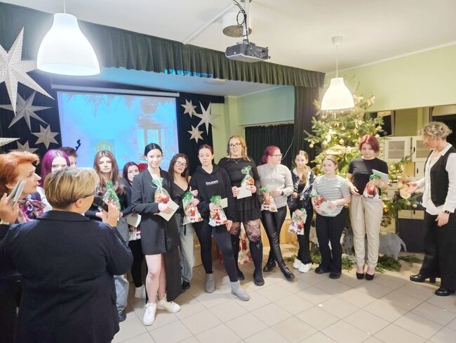 Strona kulinarna wieczoru była prawdziwą ucztą. Dziewczęta kształcące się w zawodzie kucharz, pod okiem Pań Agnieszki Schlak i Renaty Zmarzły, Pana Krzysztofa Bondyry oraz Pań kucharek przygotowały tradycyjne, wigilijne potrawy. Na stołach pojawiły się karpie, śledzie, liczne zakąski, paszteciki, krokiety, aromatyczny przepyszny barszcz oraz świąteczne słodkości. Wszystko zostało przygotowane i podane z ogromną starannością.