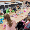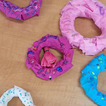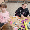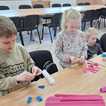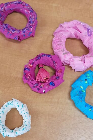 Spotkanie rozpoczęliśmy od skręcenia gazet w okręgi. Następnie dzieci owijały je kolorową krepą. Zadanie nie było łatwe, ponieważ trzeba było zrobić to w taki sposób, żeby gazeta nie przebijała. Na koniec można było ozdobić gotowe donaty klejem z brokatem, na co najbardziej wszyscy czekali.