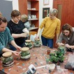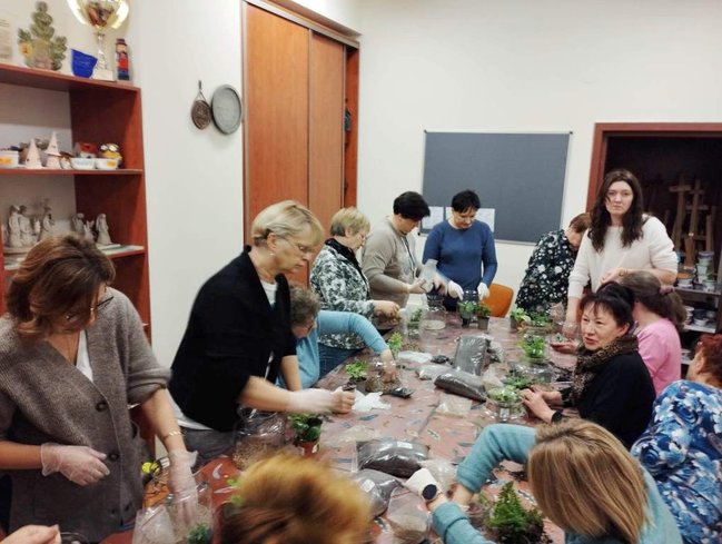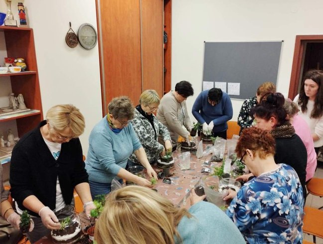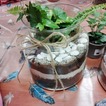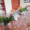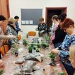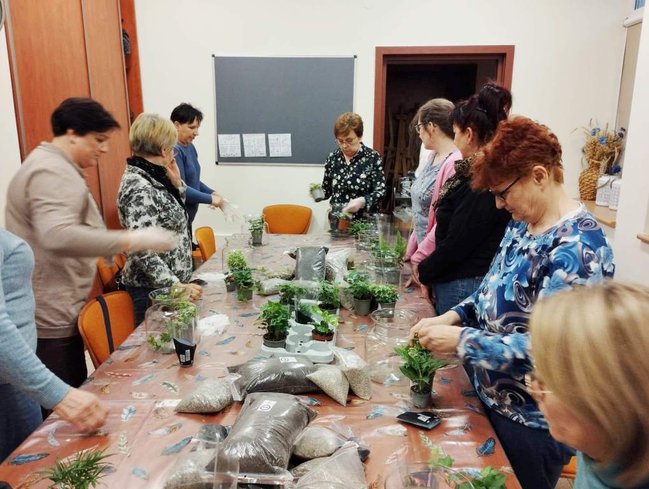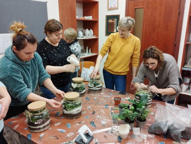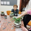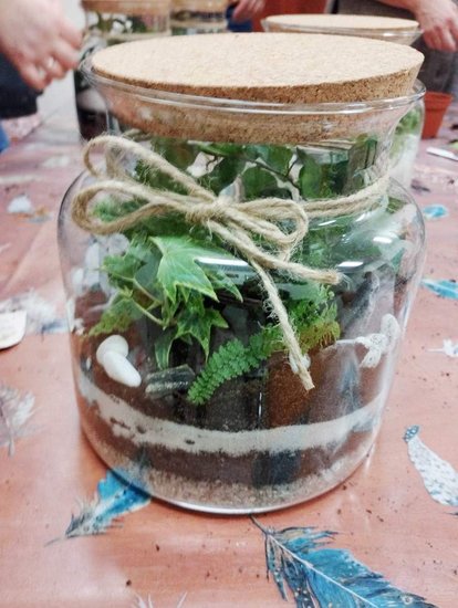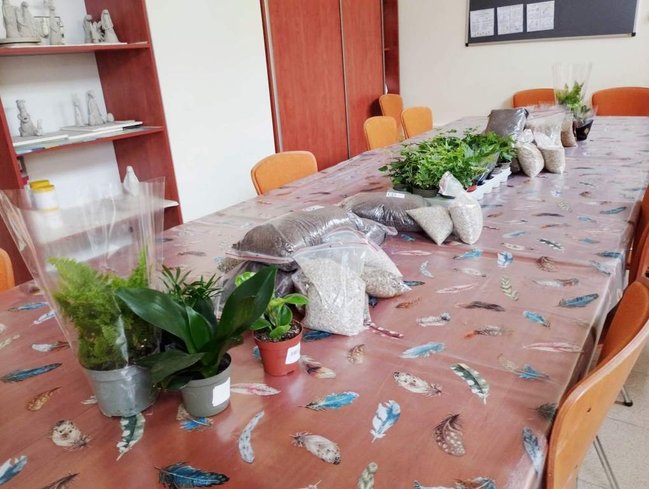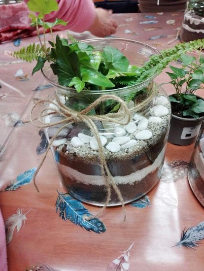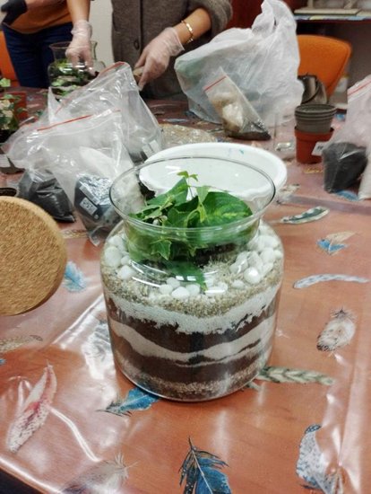 Kiedy materiały zostały rozdane mogłyśmy przejść do pracy. Najpierw w szklanym słoju należało ułożyć warstwę drenażową ze żwiru, następnie posypać węglem aktywnym, sporą warstwą ziemi i ozdobnymi piaskami. Tak przygotowany grunt można było obsadzić kwiatami. Kiedy rośliny znalazły się w słoju pozostał go tyko ozdobić wg własnych upodobań. Do dyspozycji uczestniczek były różnego rodzaju kamienie, kory i sznurki.