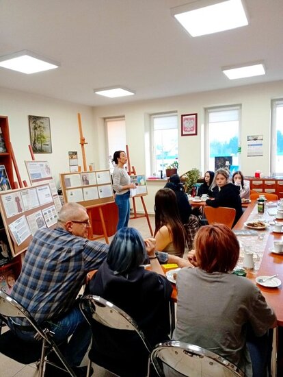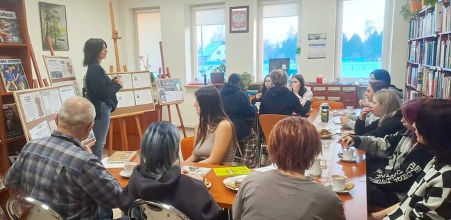 Podczas spotkania, dyrektor Gminnej Biblioteki Publicznej w Sadkach Joanna Brzozowska oraz bibliotekarka Filii Bibliotecznej w Radziczu Karolina Narloch przybliżyły uczestniczkom działalność regionalną biblioteki, zwracając uwagę na znaczenie gromadzenia i popularyzowania lokalnego dziedzictwa historycznego.
