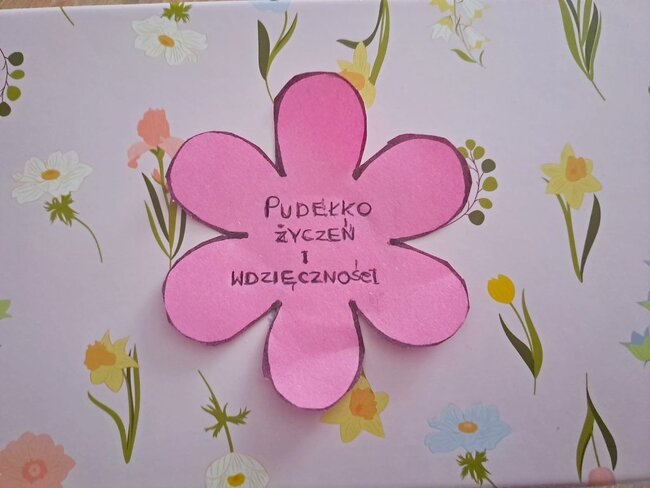 Podczas lekcji religii dzieci wraz ze swoją panią katechetką - Katarzyną Dobosz - stworzyły listę podziękowań za pięć lat posługi w naszej diecezji oraz indywidualne życzenia, zapisane na specjalnych papierowych kwiatach. Z tych wszystkich słów wdzięczności powstało niezwykłe pudełko pełne życzeń i dobra.