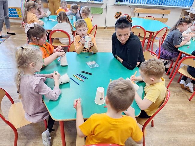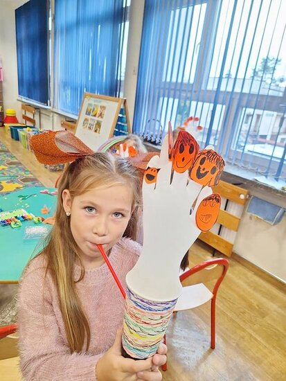Udało się nam również wyhodować dynie w doniczce. Kubek, rękawiczka, słomka i pisaki - oto przepis na dziecięce uśmiechy. Wszyscy byli bardzo dumni, mogąc nadmuchać swoje dynie.
