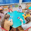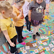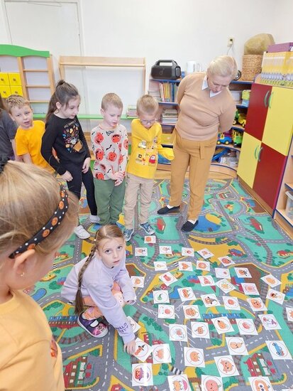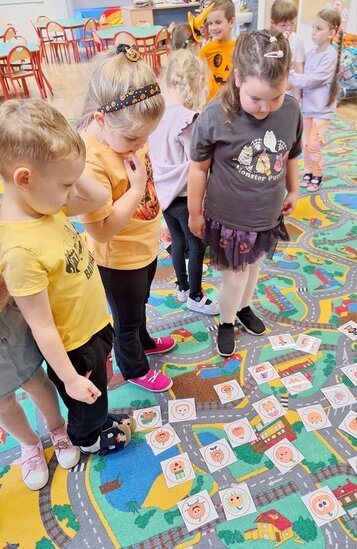 Spotkanie rozpoczęliśmy od krótkiej rozmowy o roślinie, która była bohaterką tego dnia. Dzieci z dużym zaangażowaniem poszukiwały na dywanie opisanych dyń. Było to świetne ćwiczenie na spostrzegawczość.