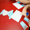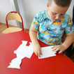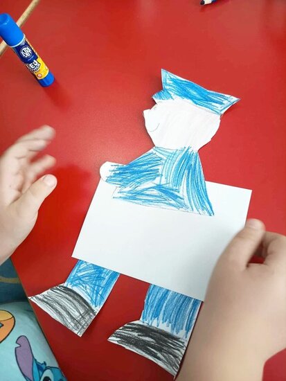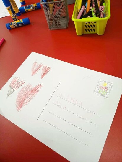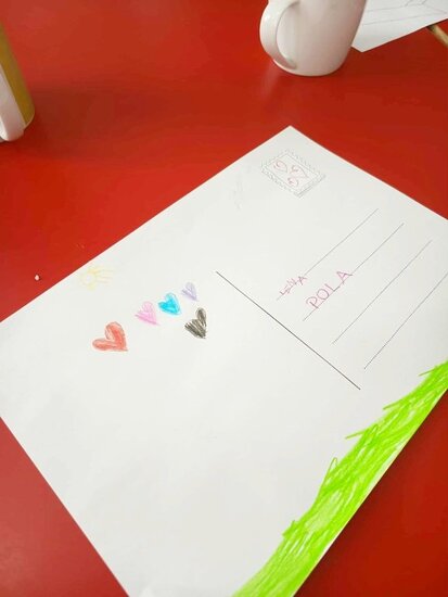 Następnie przystąpiliśmy do zajęć praktycznych. Dzieci stworzyły własną kartkę pocztową oraz papierowego listonosza z kopertą. Po wykonaniu zadania, każdy przedszkolak zaadresował list, włożył go do koperty, którą trzymał nasz papierowy listonosz. Wszyscy byli bardzo zadowoleni z efektów swojej pracy.