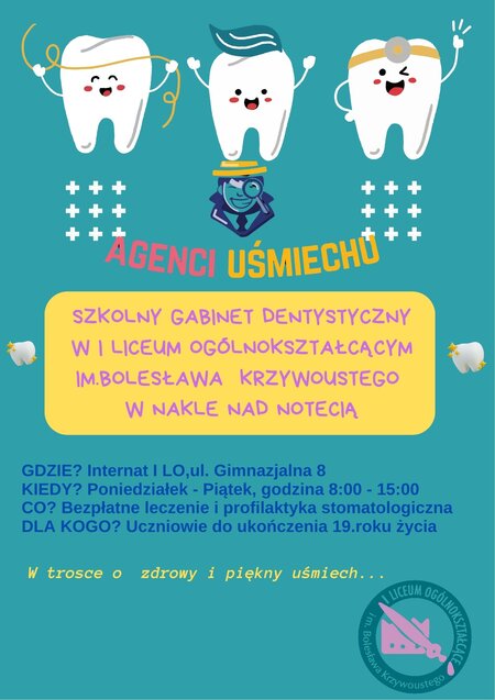 Zgodnie z zawartym pomiędzy Powiatem Nakielskim a podmiotem: Enema Sp. z o.o. porozumieniem w zakresie udzielania świadczeń opieki zdrowotnej dla uczniów, w Internacie I Liceum Ogólnokształcącego im. Bolesława Krzywoustego swoją działalność rozpoczyna w czerwcu 2025 r. szkolny gabinet dentystyczny "Agenci Uśmiechu" oferujący bezpłatną profilaktykę i leczenie stomatologiczne dla uczniów szkół ponadpodstawowych, dla których organem prowadzącym jest powiat nakielski.