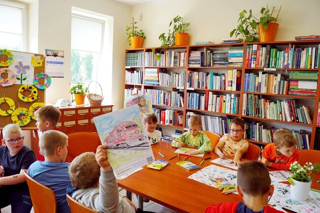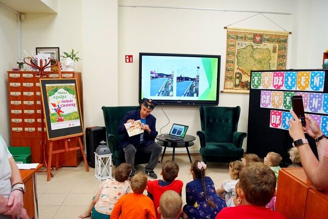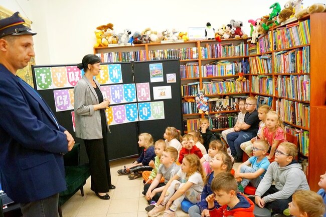 W ramach obchodów XXIV Ogólnopolskiego Tygodnia Czytania Dzieciom, dnia 3 czerwca, w naszej bibliotece odbyła się wyjątkowa lekcja biblioteczna. Gościem spotkania był pan Mateusz Górecki, który na co dzień pracuje jako nastawniczy na kolei. W niezwykle ciepłej atmosferze pan Mateusz przeczytał przedszkolakom z grupy "Pracowite Mrówki" ze SP w Sadkach, książeczkę pt. „Kicia Kocia w pociągu” autorstwa Anity Głowińskiej.