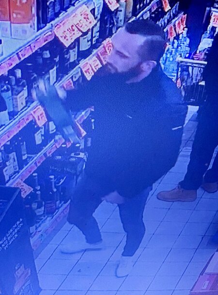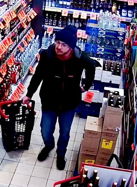 - ostatni ze sprawców – 35-45 letni mężczyzna, ubrany w kurtkę koloru ciemnego, ciemne spodnie oraz białe buty, posiadający ciemny zarost na twarzy oraz ciemne krótkie włosy również ukradł alkohol. (L.dz. 4559/25)