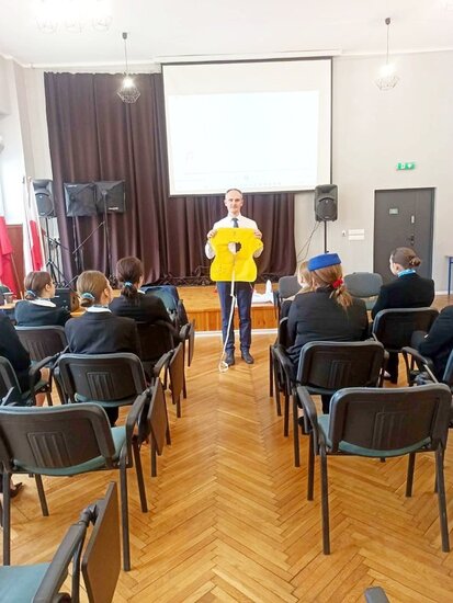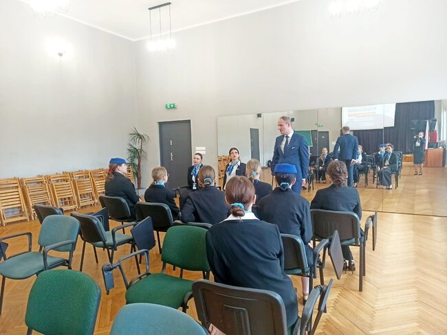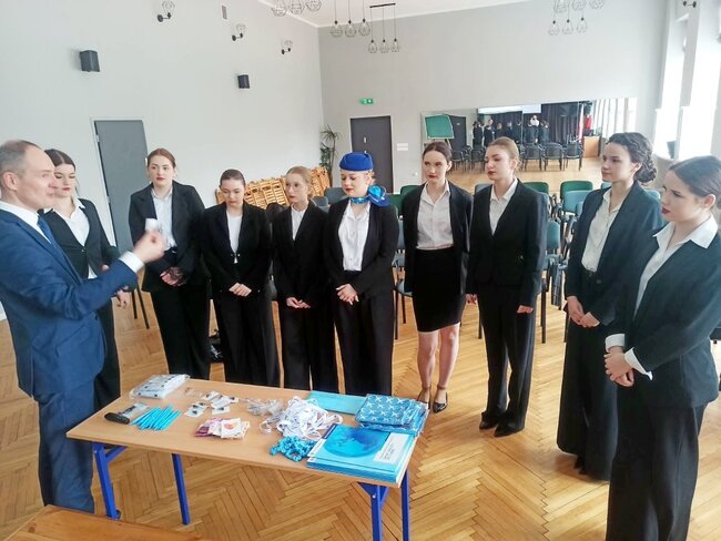 Podczas zajęć uczniowie mieli okazję zapoznać się ze specyfiką pracy personelu pokładowego, wymaganiami stawianymi kandydatom oraz realiami codziennej pracy na pokładzie samolotu. Prowadzący w ciekawy i przystępny sposób przedstawił zarówno teoretyczne aspekty zawodu, jak i praktyczne wskazówki, które mogą okazać się niezbędne w przyszłej karierze.