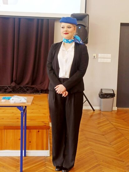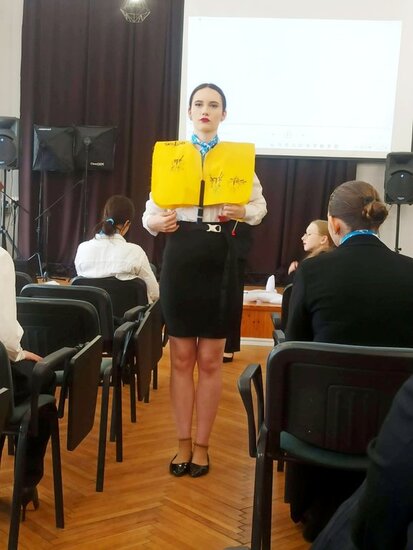 Szczególne zainteresowanie wzbudziła część praktyczna szkolenia, w trakcie której uczniowie mogli przećwiczyć elementy obsługi pasażerów, zasady bezpieczeństwa oraz procedury obowiązujące podczas lotu. Była to doskonała okazja, aby przekonać się, jak odpowiedzialna i wymagająca jest praca stewardessy i stewarda.