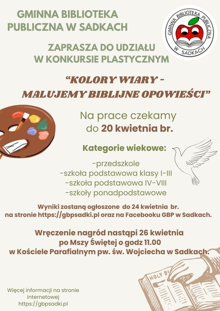 Gminna Biblioteka Publiczna #w Sadkach ogłasza konkurs plastyczny "Kolory wiary – malujemy biblijne opowieści", w którym prace można składać do 20 kwietnia.
