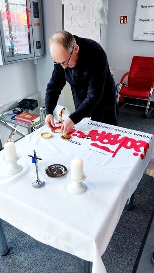 W dniu dzisiejszym na terenie# Solino S.A. odbyła się Msza Święta dla pracowników prowadzących protest głodowy. Eucharystii przewodniczył ks. Robert Różański - proboszcz parafii pw. Św. Trójcy w Górze.