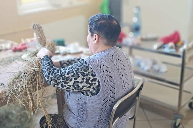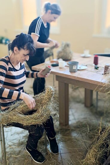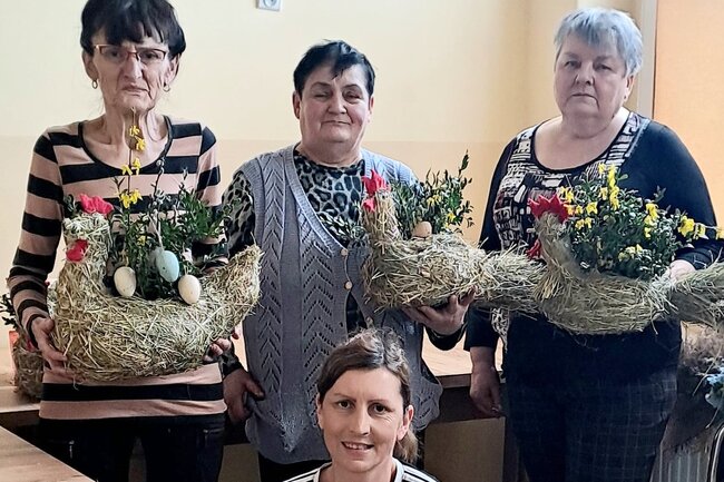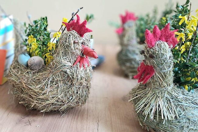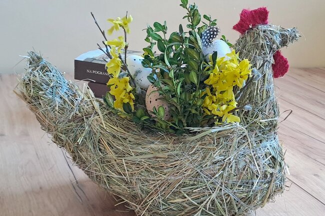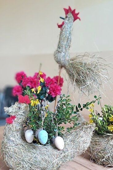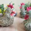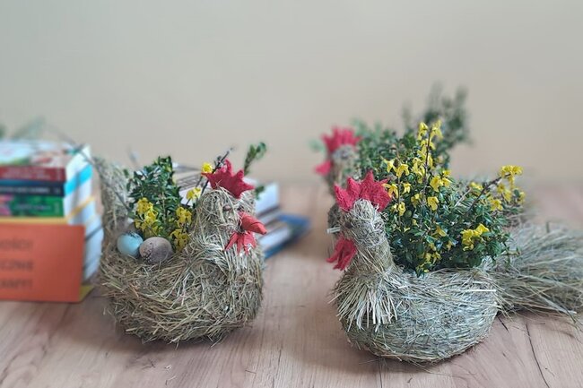 W czasie dyskusji powstały piękne kury z siana, które jako osłonki na doniczki z kwiatkami staną się świetną dekoracją wielkanocną.