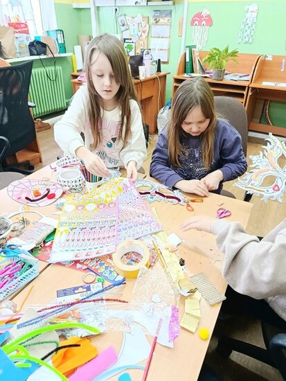 Następnie dzieci przystąpiły do części plastycznej. Z przygotowanych materiałów, takich jak kolorowy papier, krepa, piórka, taśmy cekinowe i wiele innych ozdób, uczniowie wykonali własne maski karnawałowe. Każda praca była niepowtarzalna i odzwierciedlała indywidualną kreatywność autora. Podczas zajęć panowała radosna i twórcza atmosfera.