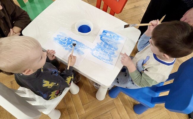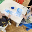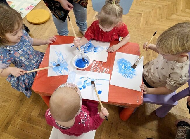 Przy pierwszym zadaniu plastycznym dzieci chętnie malowały kartki pędzlami. Po wykonaniu tego zadania ukazały się piękne obrazki.