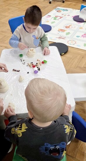 Tworzenie z masy solnej to zawsze świetny pomysł. Bałwanki były z chętnie wykonywane, a ozdabianie ich guzikami z ziela angielskiego, choć wymagało precyzji, wszystkim się podobało.