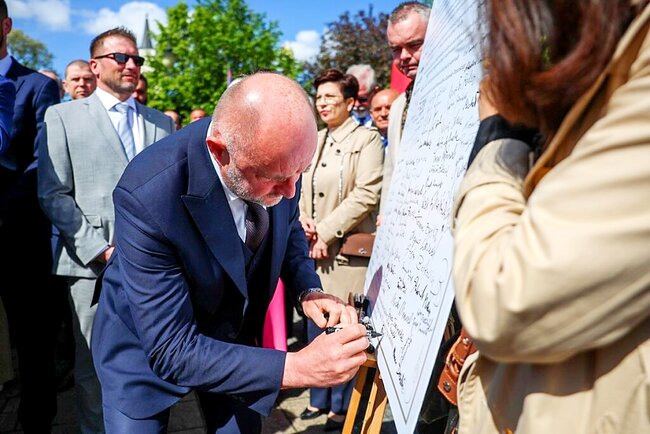Zebrani w piątek (23 maja) w Kowalu #w powiecie włocławskim samorządowcy naszego województwa wszystkich szczebli złożyli podpisy pod deklaracją z okazji 35-lecia odrodzonego samorządu terytorialnego. „Od 1990 roku budujemy Polskę opartą na współpracy, solidarności i partnerstwie. Gminy, powiaty i województwa tworzą spójny system, który skutecznie odpowiada na wyzwania, wspiera rozwój i troszczy się o tych, którzy potrzebują pomocy. Samorządność to siła — zakorzeniona w wartościach, oparta na doświadczeniu i otwarta na przyszłość” – czytamy w dokumencie. Zdjęcia do pobrania