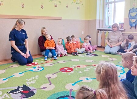 W młodszych grupach przypomniano zasady bezpieczeństwa w ruchu drogowym, w tym jak zachować się w rejonie przejść dla pieszych. Starsze roczniki posłuchały dodatkowo o odpowiedzialności karnej nieletnich oraz zasadach korzystania z hulajnóg elektrycznych.