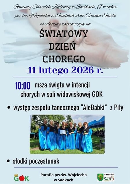 Gminny Ośrodek Kultury w Sadkach#, Parafia pw. św. Wojciecha w Sadkach oraz Gmina Sadki serdecznie zapraszają wszystkich mieszkańców na obchody Światowego Dnia Chorego, które odbędą się 11 lutego 2026 roku.