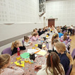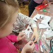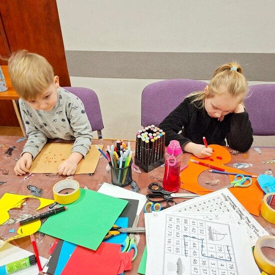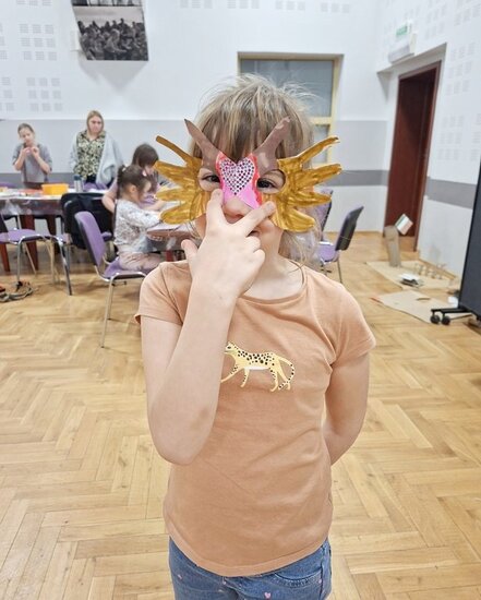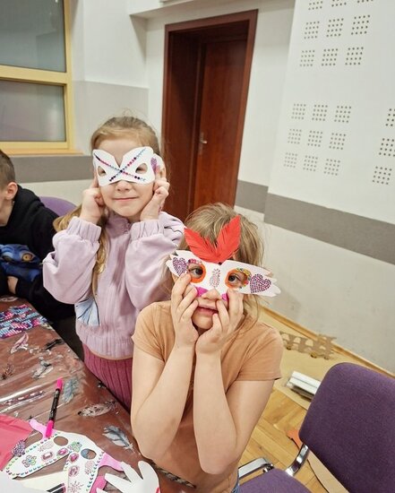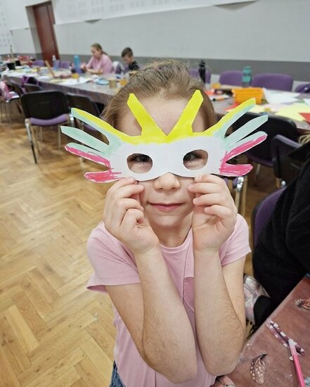 Na zakończenie chętne dzieci wykonały własną maskę wenecką, wykorzystując papierowe piórka oraz kolorowe cekiny. Była to doskonała okazja do rozwijania kreatywności, wyobraźni i zdolności manualnych.