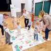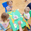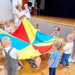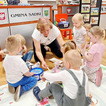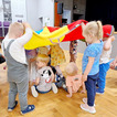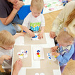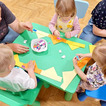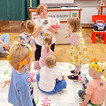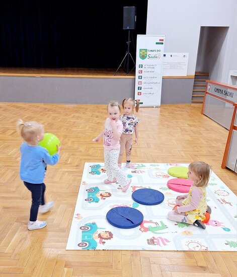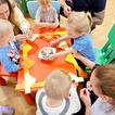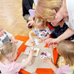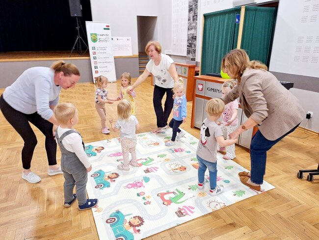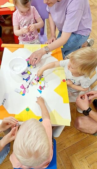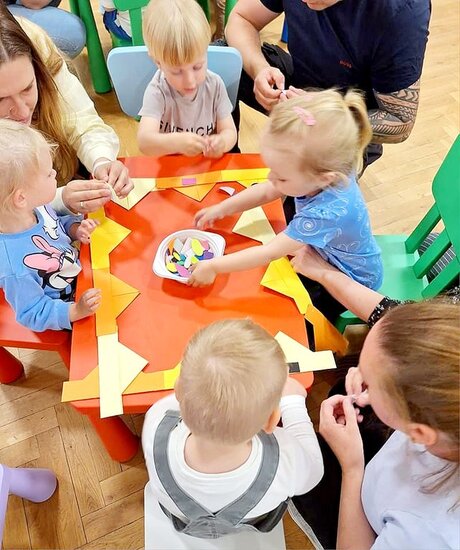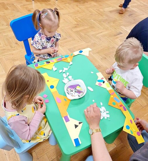 Nasze maluchy bardzo lubią pracę przy stolikach. Nigdy nie wiedzą co Pani Gienia ma dla nich przygotowane, a ponieważ prowadzącą ma mnóstwo świetnych pomysłów, zawsze chętnie wyczekują nowości. Tym razem każdy otrzymał papierową koronę, którą należało ozdobić piankowymi diamentami. Zadanie nie było łatwe, a każdy samodzielnie odklejony ksztal był sukcesem. Gotowe korony oczywiście trafiły na głowy mam (lub w ich zastępstwie - tatusiów, babć) i zaczęły się wspólne tańce.