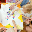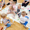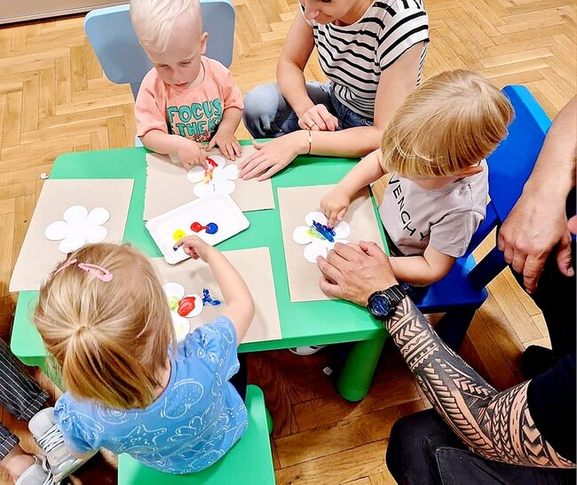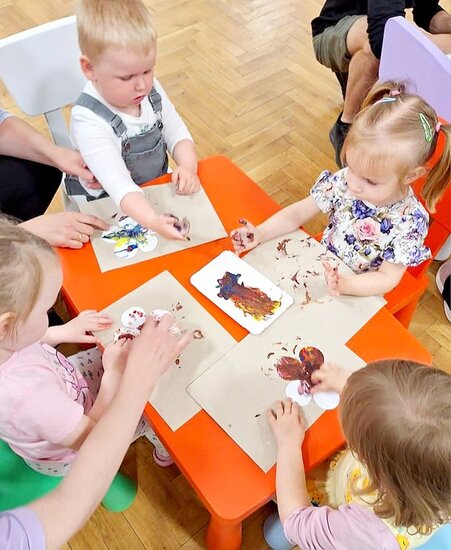 Ostatnią pracą plastyczną było wykonanie pięknych kwiatków. Tym razem jednak zrezygnowaliśmy z gąbeczek i maluchy malowały swoimi paluszkami.