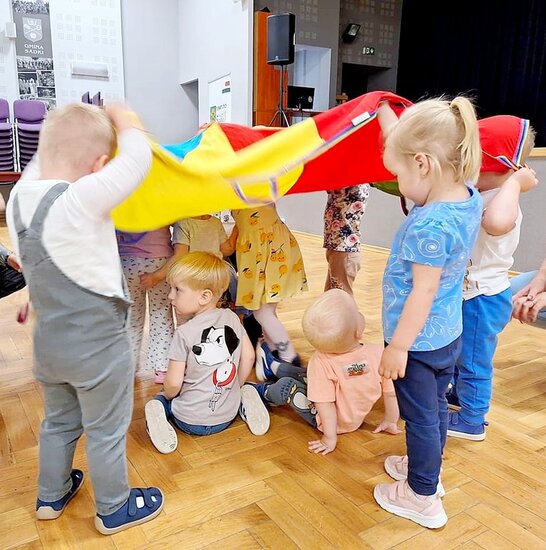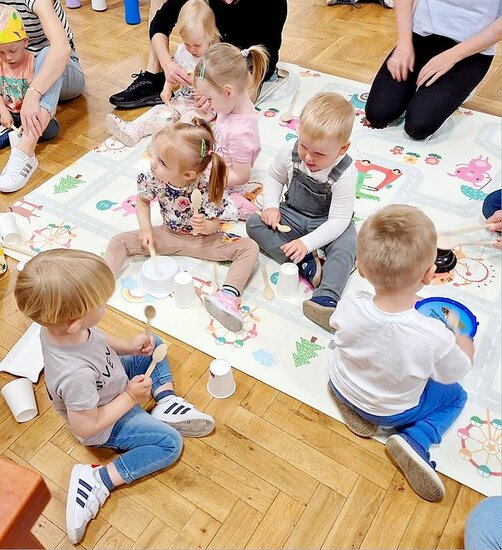 Po takiej zabawie ruchowej zostaliśmy w temacie muzyki, a maluchy złożyły swoją orkiestrę. W ruch poszły drewniane łyżki, plastikowe kubeczki i miseczki. Wszyscy chętnie próbowali swoich sił w wybijaniu rytmy. Nie mogło zabraknąć krótkiej czytanki, tym razem dzieci wysłuchały historii Kici Koci.