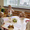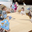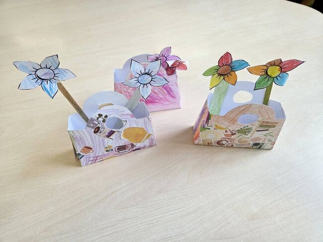 Naszą pracą plastyczną były papierowe torebeczki, które maluchy najpierw kolorowały. Z przyjemnością naklejały na nie różne naklejki. Po złożeniu mogły umieścić w nich kwiatki z papieru, które także samodzielnie wykonały.