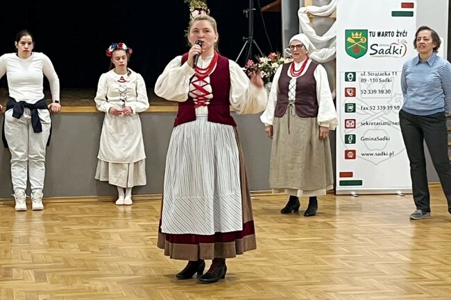 Pani Ewelina Gondek w kilku słowach przybliżyła historię Zespołu Folklorystycznego Sadkowianie oraz Dziecięcego Zespołu Jabłoneczka. Ich Członkowie zaprezentowali kilka tańców, a także znane przyśpiewki. Nie zabrakło informacji na temat ubrań i nakryć głowy. Nad oprawą muzyczną czuwał Pan Roman Andrzejewski, za co serdecznie dziękujemy.