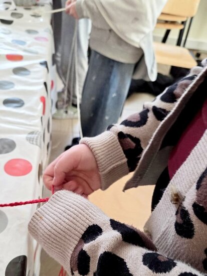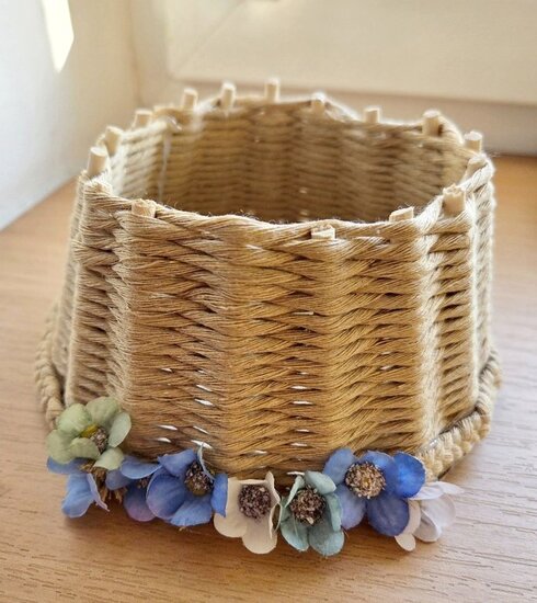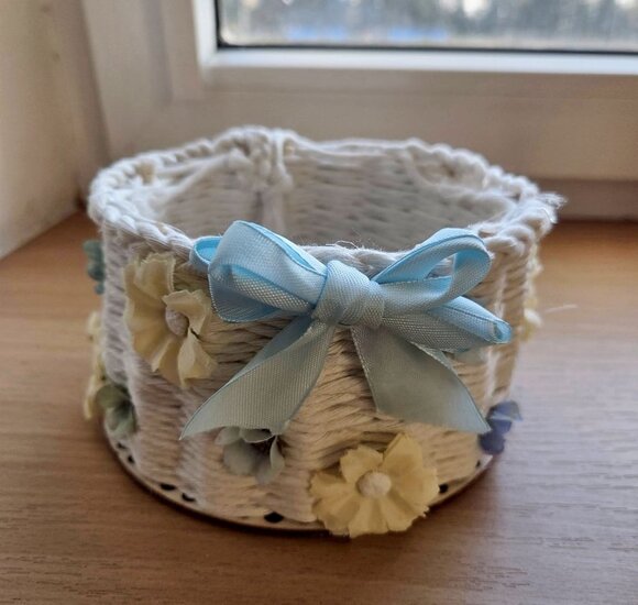 Drewniana baza i patyczki stworzyły tzw. szkielet. Następnie w ruch poszły kolorowe sznurki. Część osób wykonała tę pracę już na poprzednim spotkaniu. Wówczas wykańczały one koszyczki, a także dekorowały je kokardkami, kwiatkami itp. Każda praca była inna, wszystkie wykonane z dużym zapałem.