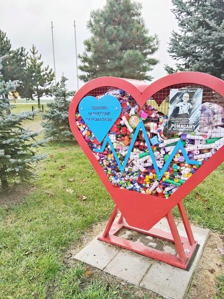 Serduszko do zbierania nakrętek, które pojawiło# się w Dębowie w październiku zeszłego roku, w minionym tygodniu już SZÓSTY raz zostało zapełnione po sam brzeg.