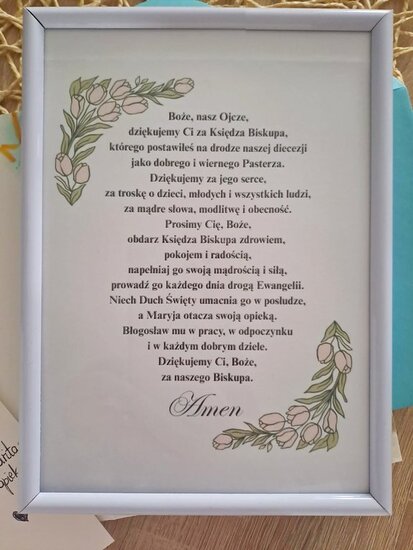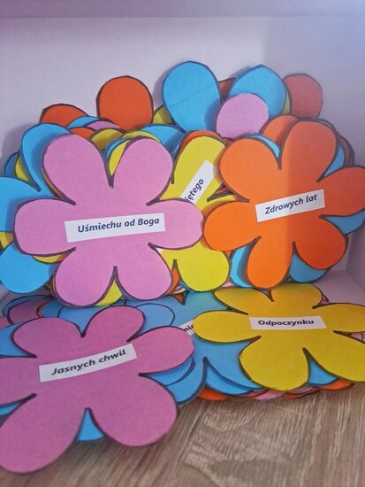 Podczas lekcji religii dzieci wraz ze swoją panią katechetką - Katarzyną Dobosz - stworzyły listę podziękowań za pięć lat posługi w naszej diecezji oraz indywidualne życzenia, zapisane na specjalnych papierowych kwiatach. Z tych wszystkich słów wdzięczności powstało niezwykłe pudełko pełne życzeń i dobra.