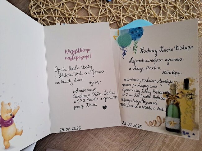 Uczniowie Szkoły Podstawowej nr 2 w Nakle nad Notecią oraz wolontariusze Szkolnego Koła Caritas, pamiętając o swoim pasterzu, przygotowali z okazji jego urodzin wyjątkowe upominki.