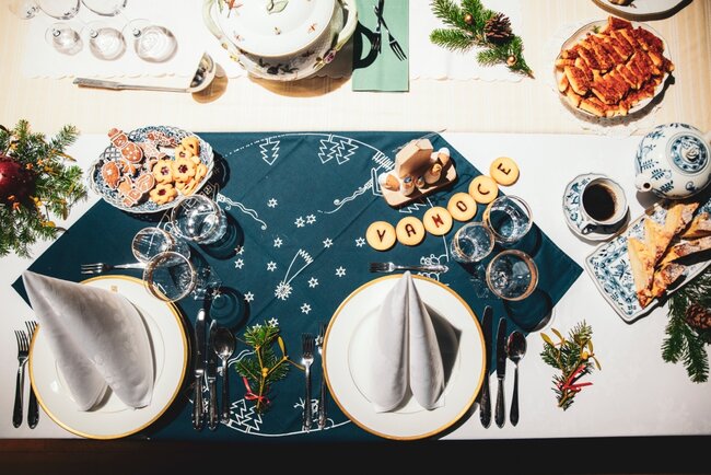Cała rodzina zbiera się, by świętować Boże Narodzenie. Stół zdobią gałązki sosny, świece, suszone pomarańcze, laski cynamonu i suszone goździki.
