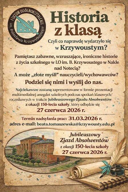Najciekawsze zostaną zaprezentowane w formie prezentacji multimedialnej anegdot szkolnych podczas spotkań klasowych/rocznikowych w trakcie Jubileuszowego Zjazdu Absolwentów z okazji 150-lecia szkoły, który odbędzie się 27 czerwca 2026 r.