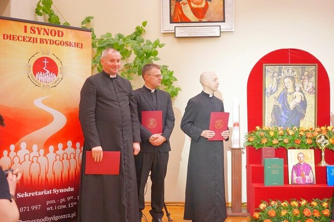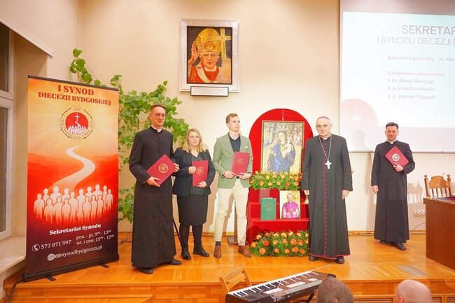 Podczas sprawozdania z okresu presynodalnego wikariusz generalny diecezji bydgoskiej – ks. kanonik Tomasz Cyl – przypomniał, że dokładnie 19 grudnia 2024 roku biskup ordynariusz powołał Komisję Przygotowawczą do I Synodu Diecezji Bydgoskiej. Tworzyło ją 18 osób – 5 świeckich, 2 siostry zakonne i 11 kapłanów diecezjalnych i zakonnych. – Nasze prace rozpoczęliśmy 10 lutego 2025 roku, a później co miesiąc spotykaliśmy się, by przygotować to, co dzisiaj, dzięki woli Bożej i światłu Ducha Świętego, się zaczyna – mówił, dziękując wszystkim zaangażowanym w prace komisji.