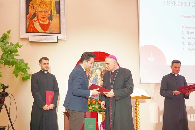 Po wykładzie biskup Krzysztof Włodarczyk wręczył dekrety powołujące Sekretariat Synodu, Zespół Legislacyjny, Biuro Prasowe I Synodu DB, Zespół Logistyczny i Ceremoniarza Synodu. Sekretarzem generalnym powołany został ks. Karol Rawicz-Kostro. – Bardzo cieszę się, że mogę spojrzeć teraz prosto w oczy wszystkim, którzy do tej pory byli dla mnie anonimowi. Spotykaliśmy się w ramach parafialnych grup presynodalnych – powiedział, dodając, że efektem wspólnych działań jest synteza presynodalna. – Przed nami harmonogram prac, które chcemy podjąć z powołanymi parafialnymi grupami synodalnymi. Tym bardziej cieszymy się obecnością tak licznie zgromadzonych animatorów, sekretarzy z duszpasterzami. Odtąd będziecie współodpowiedzialni za przeprowadzenie synodu na gruncie wspólnoty parafialnej. Ufam, że to, o czym dzisiaj słuchaliśmy, stanie się naszym udziałem, rzeczywistością odnowy także wspólnot parafialnych, a przede wszystkim odnowy relacji – mówił.