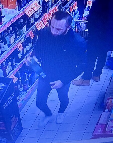 - ostatni ze sprawców – 35-45 letni mężczyzna, ubrany w kurtkę koloru ciemnego, ciemne spodnie oraz białe buty, posiadający ciemny zarost na twarzy oraz ciemne krótkie włosy również ukradł alkohol. (L.dz. 4559/25)