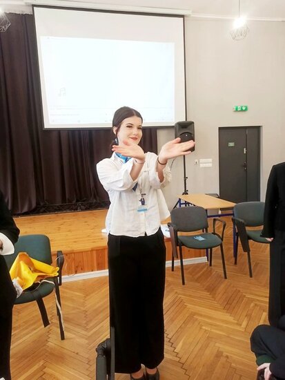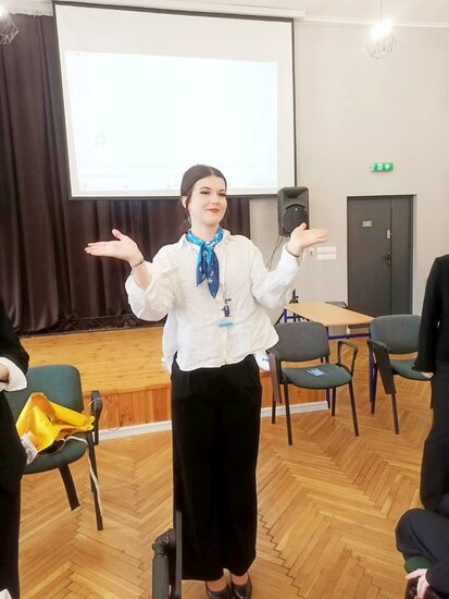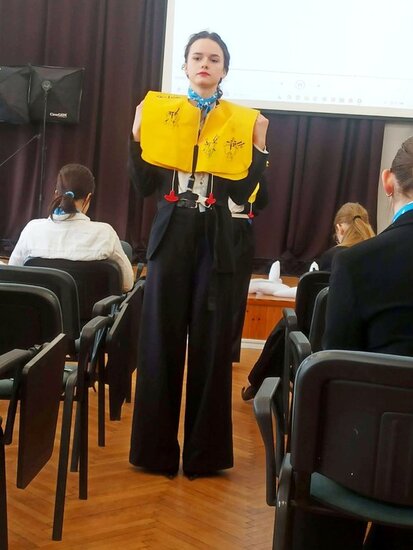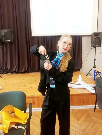 Szczególne zainteresowanie wzbudziła część praktyczna szkolenia, w trakcie której uczniowie mogli przećwiczyć elementy obsługi pasażerów, zasady bezpieczeństwa oraz procedury obowiązujące podczas lotu. Była to doskonała okazja, aby przekonać się, jak odpowiedzialna i wymagająca jest praca stewardessy i stewarda.