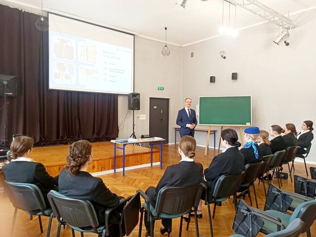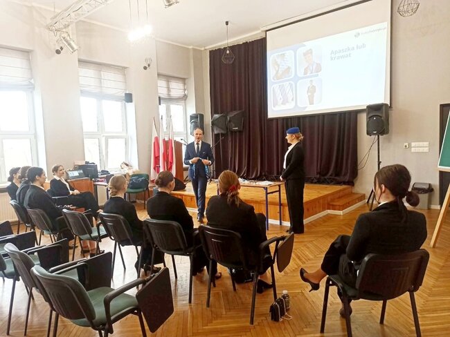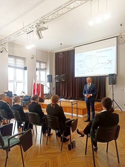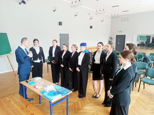 Podczas zajęć uczniowie mieli okazję zapoznać się ze specyfiką pracy personelu pokładowego, wymaganiami stawianymi kandydatom oraz realiami codziennej pracy na pokładzie samolotu. Prowadzący w ciekawy i przystępny sposób przedstawił zarówno teoretyczne aspekty zawodu, jak i praktyczne wskazówki, które mogą okazać się niezbędne w przyszłej karierze.