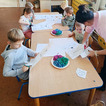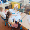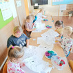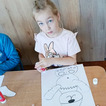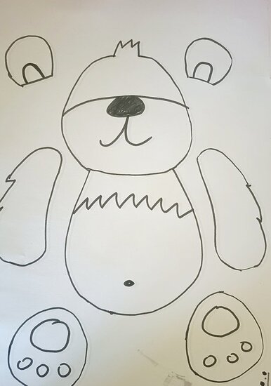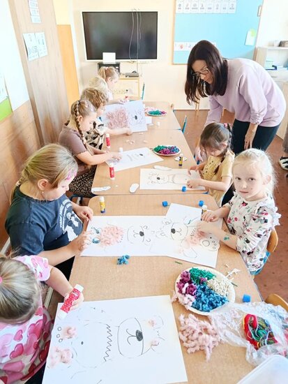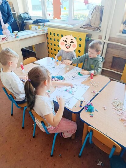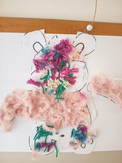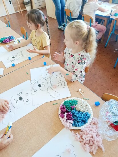Po rozmowach przyszedł czas na działanie twórcze. Uczestnicy wykonali pracę plastyczną- misiową wyklejankę. Każde dziecko otrzymało kontur misia, który należało wyciąć i odpowiednio przykleić na kartce od bloku, a następnie wypełnić fragmentami pociętej wełny. Było to zadanie, które poćwiczyło motorykę małą, cierpliwość oraz wyobraźnię małych artystów.