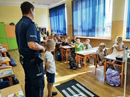 Mundurowi opowiedzieli dzieciom z najmłodszych klas na czym polega ich codzienna służba. Policjanci omówili również bardzo ważne zasady dotyczące szeroko rozumianego bezpieczeństwa. Informowali o przepisach ruchu drogowego i radzili, jak bezpiecznie poruszać się po drodze. Przypomniano maluchom, jak należy przechodzić przez jezdnię, przestrzegano przed wbieganiem na ulicę, a także przed przebieganiem pomiędzy samochodami.