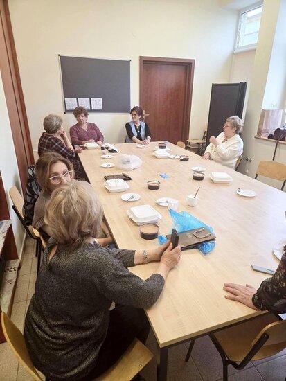 Tym razem Panie miały okazję zjeść wspólny obiad i skosztować pysznego ciasta Pani Mirki (dziękujemy). Nie brakowało wspominania projektowych zajęć oraz opowiadania o tym, co działo się po projekcie. Z ogromną przyjemnością słuchało się wspomnień Pań. Sadki widziane ich oczami kilka lat temu są pięknym miejscem. A ich anegdoty rodzinne dawały wiele powodów do śmiechu. W takim gronie po prostu chce się przebywać. Dlatego kolejne spotkanie organizujemy już w lutym.