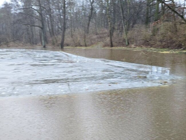 Poziom wody na stawie w# Smogulcu osiągnął nienotowany dotąd poziom. To efekt gwałtownych roztopów i zalegającej pokrywy lodowej.