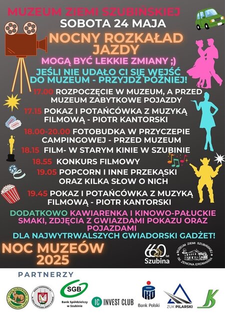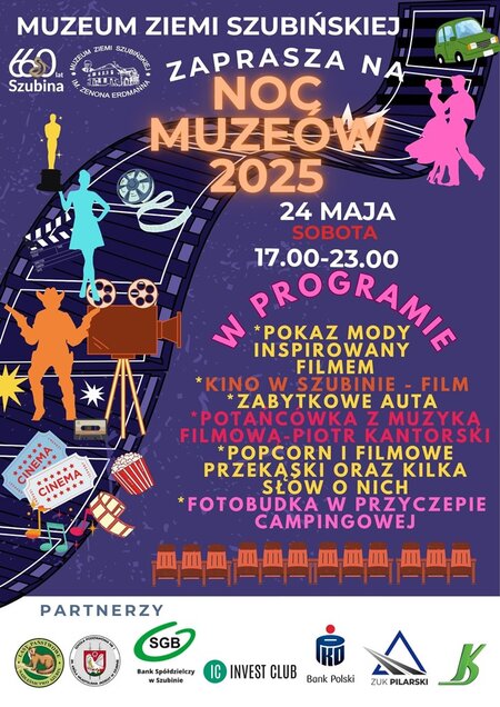 W programie m.in. - Pokazy mody inspirowane filmami i serialami, które znamy i kochamy! Na parkiecie wystąpią modelki i modele w strojach z epoki. To będzie prawdziwa podróż w świat polskiego i światowego kina - od Czarnych chmur do Pulp Fiction! - Film o kinie w Szubinie - film paradokumentalny o kinie w Szubinie! Kino stacjonarne, latające, letnie, objazdowe ... - Zabytkowe auta przed budynkiem Muzeum! Nie tylko maluch... Przyjdź i zobacz co mają w swoich kolekcjach nasi mieszkańcy! - Potańcówka z muzyką filmową i serialową -Piotr Kantorski! Rozchwytywany DJ jak zawsze da z siebie 1000% normy! - Popcorn i filmowe przekąski oraz kilka słów o nich dla tych, co kochają jeść i oglądać filmy kulinarne! O tym opowie nam Artur Przemorski. - Fotobudka w przyczepie campingowej z czasów PRL-u! Jak na Muzeum przystało tu nie pędzimy za nowinkami, a doceniamy stary, polski dizajn. - Stoiska partnerów! Wsparcie na NOC MUZEÓW 2025 otrzymaliśmy i nie kryjemy tego! - Upominki dla najwytrwalszych - Alibi zapewnia Muzeum;) - Duża dawka pozytywnej energii i zabawy. Przyjdź w stroju inspirowanym filmem lub serialem! Bądź z nami od 17.00, 18.00, 19.00, 20.00...... to będzie długi dzień . Warto przyjść o różnych godzinach i nie zrażać się wypełnioną salą! Zabawa potrwa do nocy!
